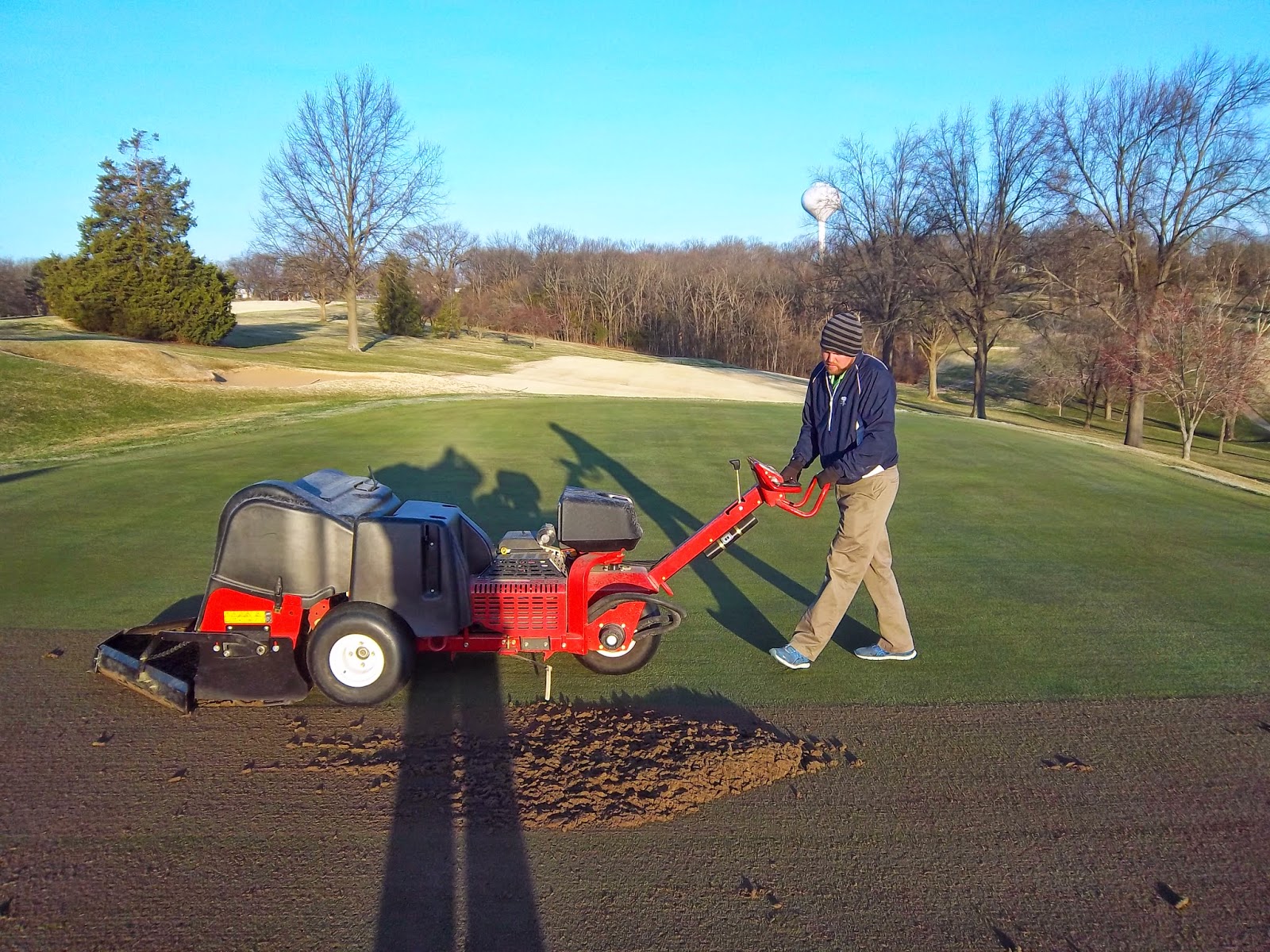 One of the draw backs about playing golf in the winter is the damage done to greens by balls hitting the greens. During the winter the Bentgrass greens are not growing and can easily be damaged by a ball hit to the greens. It is most severe when the greens are frozen. When the ball strikes the green it will kill the turf on that spot. Par 3 are the most troublesome because most shots fly directly to the green, longer holes balls can run up to green. We can have hundreds of spot throughout a green. The good news is the ball marks will fill in as it warms up this spring. Below are some pictures of # 14 green showing the damage.